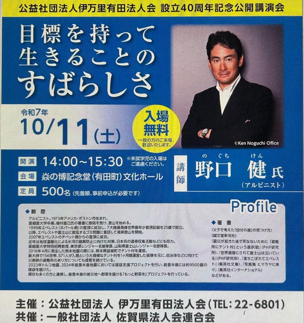 2025年10月11日(土) 野口健講演会in有田(炎の博記念堂文化ホール)